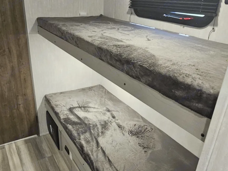 General Specs & Build QualityLength: 30′ 5″ total exterior, 8′ wide, 11′ tall, with a 20′ power awningFloorplan & Living SpacesSleeps 7 comfortably: front queen bed + rear bunkhouse with four bunks (quad bunks)Queen bed: In front bedroom with overhead storage. A curtain separates the bedroom from. The rest of the trailer.Bunkhouse: Four bunk beds in the rear, with storage underneath and easy access to the full bathroomKitchen & DiningAppliances: 8 cu ft 12V refrigerator, 2 Burner cooktop and microwave ovenSink & prep space: Two-bowl sink with cover and backsplash; U-shaped dinette seating that converts into an extra bedConvenience: USB ports, cable TV hookup, friction-hinge doors, outside shower (hot & cold) for easy cleanupBathroom & ComfortFull rear bath (24″×36″ shower, foot-flush toilet, tub/shower surround)Climate control: This unit has two 13.5 k BTU A/C, 30 k BTU furnace for year‑round comfortWater; 40 gal fresh, 64 gal gray, 32 gal black tank capacitiesExterior & Utility FeaturesAwning: 20′ powered with adjustable legs-Construction & QualityRobust build: Huck-bolt assembly, aerodynamic front profile, reinforced aluminum sidewalls, seamless roof membraneSafety & performance: Maximum cargo capacity within 8′‑wide footprint, ensuring towability and efficiencySummaryThe 2025 Viking 25QBH is a well-rounded full-featured family bunkhouse trailer—perfect for large families or groups. It balances sleeping capacity and functionality neatly in a 30-foot trailer, and adds quality touches like a 20-foot awning, tankless hot water, solid construction, and built-in solar prep. Its build quality and thoughtful design make it a standout in its class.