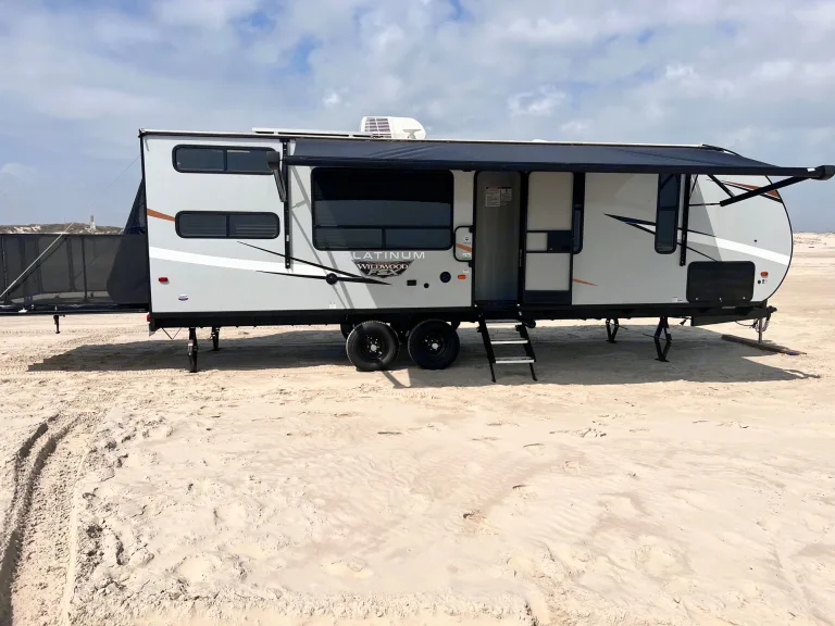 Brand new bumper pull forest river platinum wildwood fsx 270rtkx less than 100 miles equipped with all the bells and whistles with kitchen 2 fridges stove microwave and grills interior and exterior with interior and exterior Bluetooth sound system. There is plenty of storage as well. There are floor mounts throughout to tie down motorcycles or atvs as well as well led lit awning. The back door also converts to elevated porch with guardrails and screen. as well tv as sleeps 5 comfortably. Great for the beach or camping. There is an outside shower to rinse off as well as shower inside. There is a screen door in the back as well. We offer linens and silverware and dishes upon request . Two propane tanks on board. Great quality camper all around a must see. Great for all sorts outdoor events and entertainment. We deliver if need be for a separate fee up to 50 miles.What's includedCamping chairs table full propane tank and tongue lock and hitch available as well.RecommendationsDrop the back patio and enjoy the lifted screened porch.