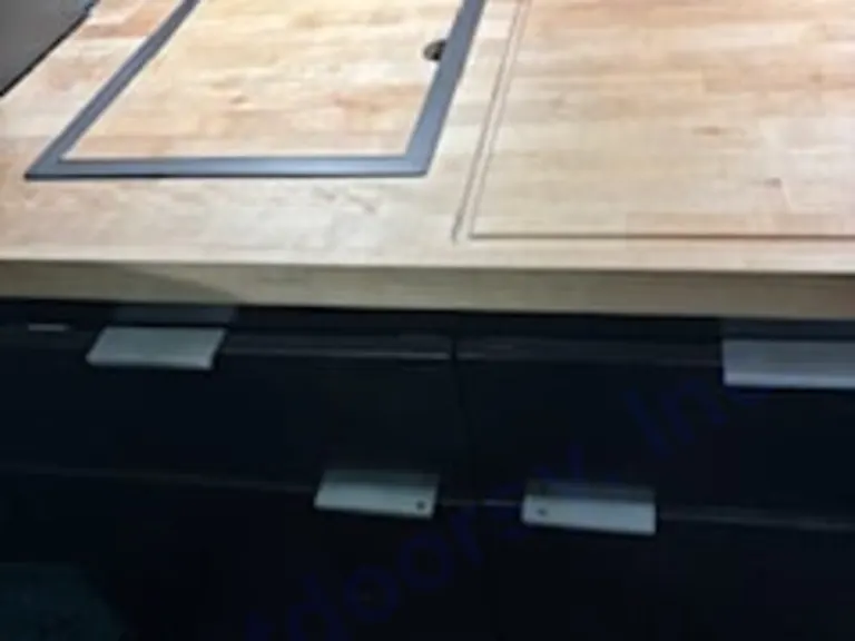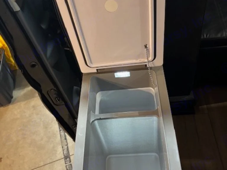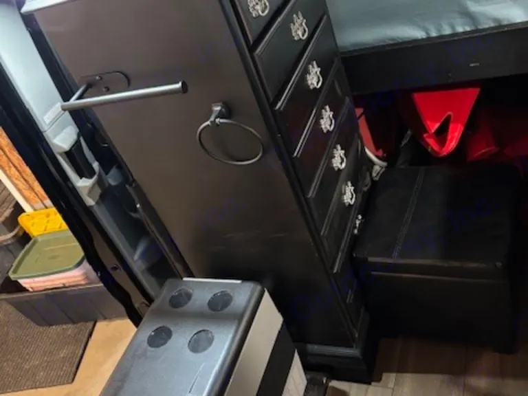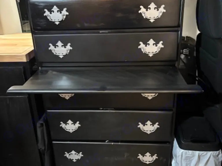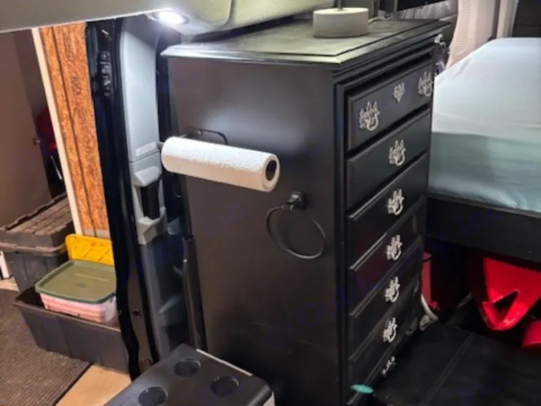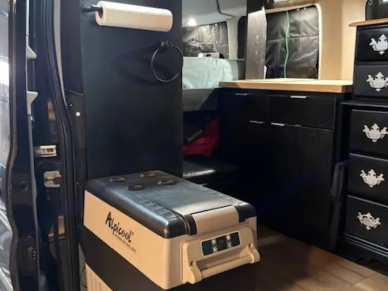 Inside this RV rental: Alpicool portable freezer, custom black cabinetry, and a dresser with decorative pulls, offering storage.. Ford Transit 2019