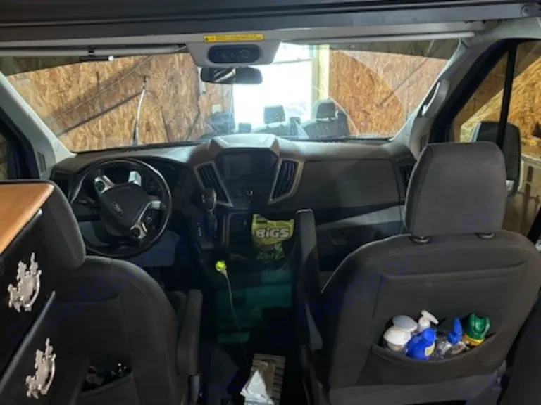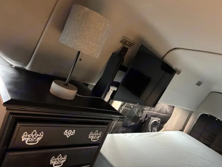 This RV rental features efficient van life design: a tall dresser with a lamp, TV, cooler, and ottoman provides compact storage.. Ford Transit 2019