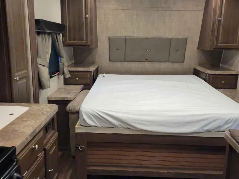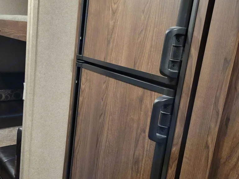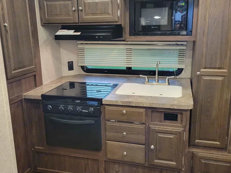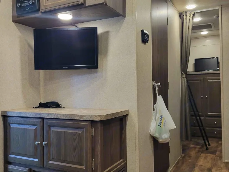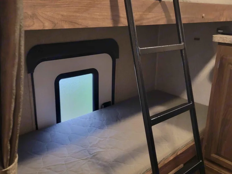 Unique layout in this travel trailer. Murphys bed up front, and quite comfy I may add. When bed is not in use, the couch is very comfortable and faces a TV. One slide out that makes the kitchen bigger. The back of the trailer is a separate room with 4 bunkbeds.. .. yes 4! Two of these can be folded up and it becomes a table. There is also a second TV in this area.