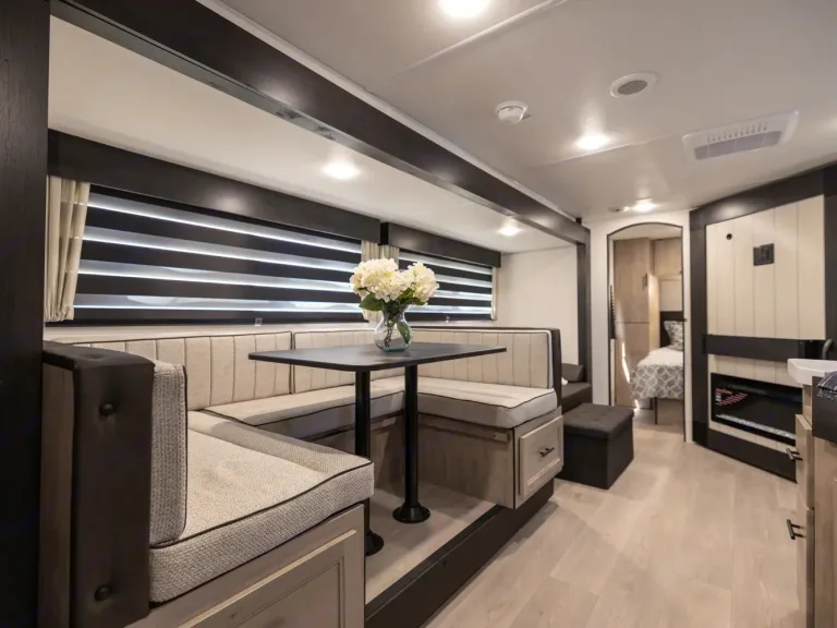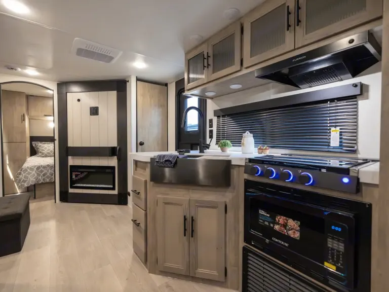Inviting RV rental interior showcasing a cozy bedroom, electric fireplace, and a light wood door, offering comfort for travel.. Forest River Cherokee Grey Wolf 2025