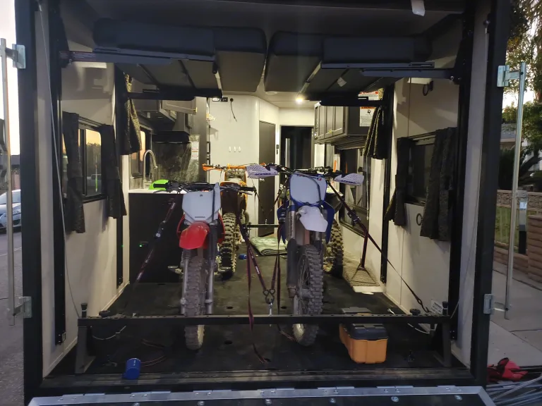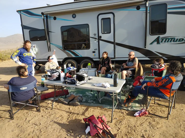 *** Inquire about a Free Loading NIght ***Our Eclipse Attitude is a brand new trailer. It sleeps 6 comfortably with 2 full queen beds and fold out couches that create another queen size sleeping area. At just under 6k lbs dry a half ton truck can do the job. With a 100 gallon fresh water tank and 30 gallon black and grey water tanks you can easily go 4-5 days without hookups or dumping.We love pets! We don't leave ours behind so we don't expect you to. We ask to keep larger dogs off of the beds and couches. If you have smaller animals, please cover the couches to protect from scratches and tears.Please be sure you have the 7-pin adapter for the light system for the trailer. Also, while not required, we highly recommend having break assistance. If you have any questions about this, please let us know.Please let us know honestly if you have experience towing. If you don't we have some very important tips for you.What's includedWhile we continue to add amenities to make your trip more fun and less work, the only thing you should need to bring are blankets and pillows. We supply dishware for 8, plus most of the kitchen utensils you'll need to cook your favorite family meals. We even include a 5 cup coffee pot. We also provide camper toilet paper. Please be sure to only use this in the toilet.For outside relaxation, we have for you 4 director type chairs, outdoor table and large outdoor mat. There are two propane tanks (filled for your convenience) but one should last at least a week. We have added a roll up floor cover for the garage area to help protect it from any toys you may bring along.While the awning is unavailable, we do provide up to two easy up canopys for your convenience.For those of you hauling dirt bikes and/or ATV's we have Bolt It On tie down system for quick, easy and safe loading and unloading of your toys.RecommendationsWe are a dirt bike riding family so a couple of our go to's are El Mirage Lake Bed and Bell Mountain. We also like to camp. We love the Kern River and Big Bear. We recently camped in Lake Tahoe and that was a wonderful trip.Other things to notePick up time is as early as 10am. Drop off time is 3pm. We like you to be back during day light hours however we do understand things come up. Let us know your situation and we can adjust if necessary.There is a 60 - 90 minute orientation on the day of pick up to explain all the workings of the trailer and the hook up procedures.Cleaning fees are always a question. We are very COVID conscious so therefore before each rental, we do a thorough clean, pulling everything and disinfecting all surfaces, including linens provided. We also do a throrough clean and flush of the black tank upon return whether you empty it or not. We do these things to insure you are getting a clean and sanitized vehicle for your trip.
