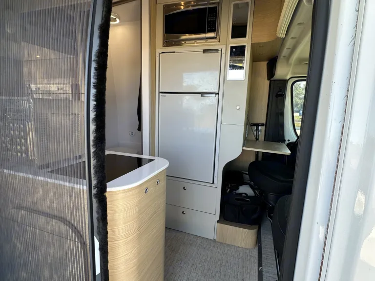 Explore this modern **rv rental** interior: a compact kitchen, elevated bed, and private shower/toilet area for travel.. Noovo Noovo Class B 2024