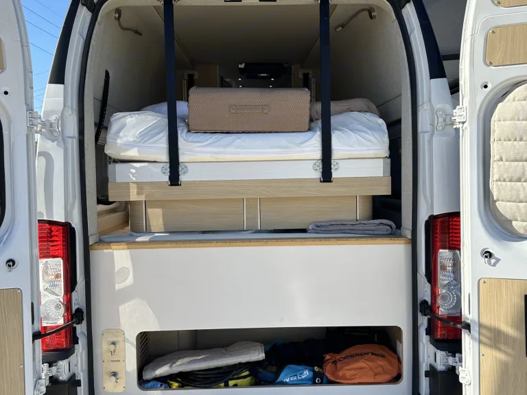 Rear view of an RV rental camper van with open doors, revealing a custom interior with an upper bed, lower storage, and modern wooden details.. Noovo Noovo Class B 2024