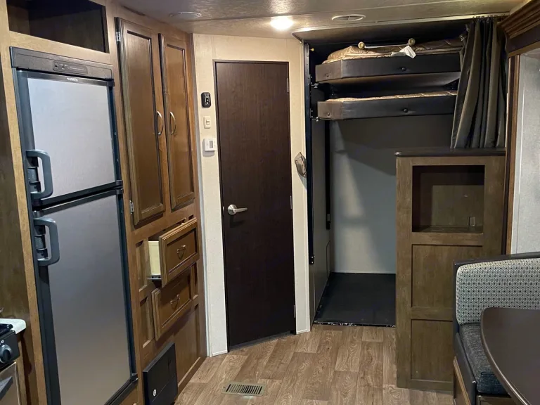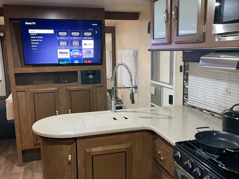 Next is the L-shaped kitchen providing the tools to prepare whatever you are hungry for, whether it’s a snack or a hearty meal for all on board! There is a propane/electric refrigerator, 3-burner stove top, oven, microwave, sink, and tons of storage. There is also a pet drawer below the refrigerator so your dog can have secure food and water.
