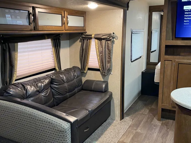 Are you ready to go camping for the week or weekend? This camper will be great for a couple or a whole family with plenty of room! On the Outside, you’ll find conveniences like black tank flush, electric awning with Led lights, spray hose, Pass Thru Storage for easy access. There is a sofa and comfortable dinette, providing places to sit and converting to beds. Catch a flick on the 4K Roku Tv with easy Connection to your phone's Hotspot to the bottom you will find the radio that can be easily connected to Bluetooth, Residential Queen Size bed has been added for extra comfort rear Bunk Beds can be Raised for extra Storage.