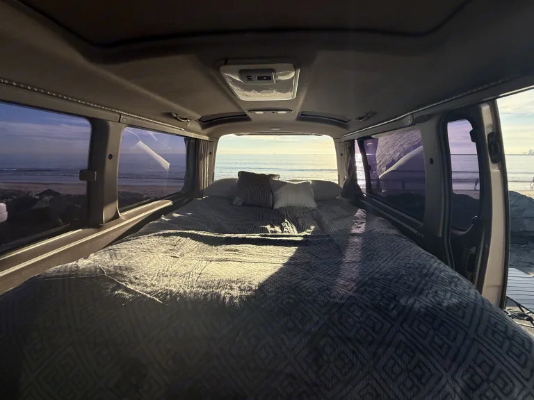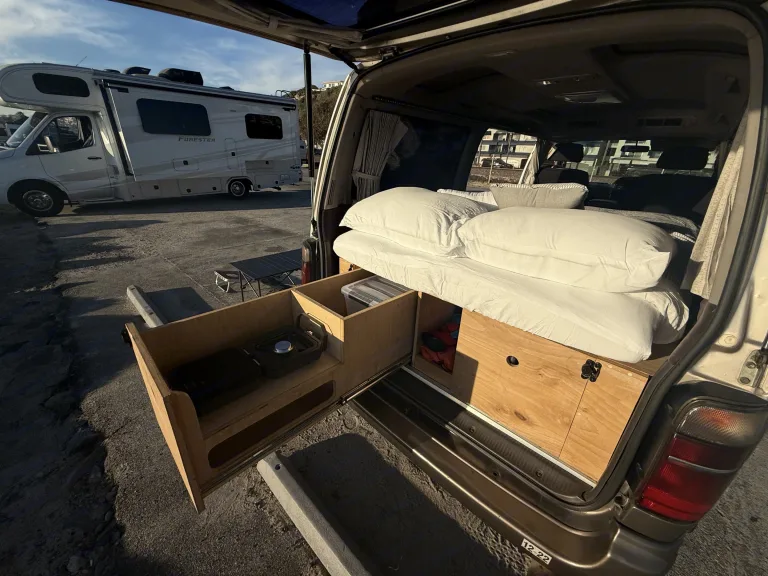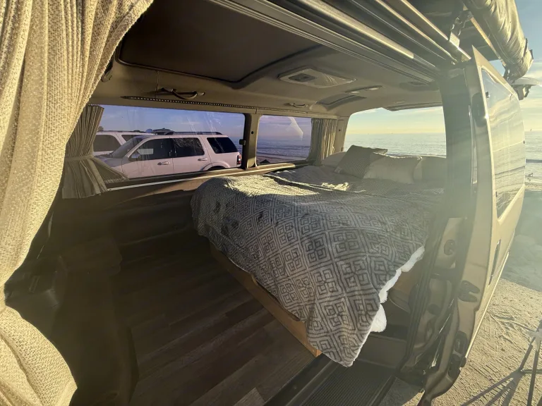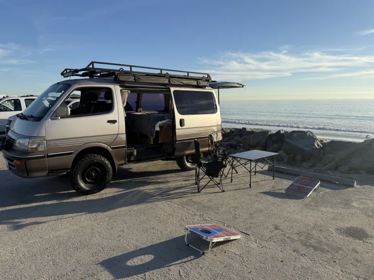 Relax in this cozy rv rental campervan! Enjoy a comfortable bed with stunning beach and ocean views, perfect for van life adventures.. Toyota Hiace 4WD 1994