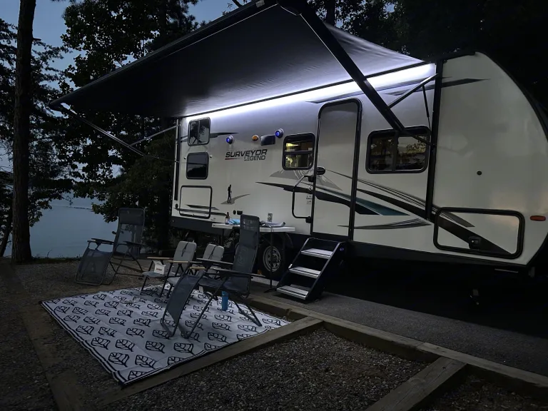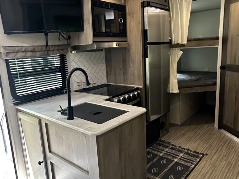 - the automatic awning and cool LED lights trim this camper and provide shade from the sun and light in the evenings.Inside you'll enjoy: