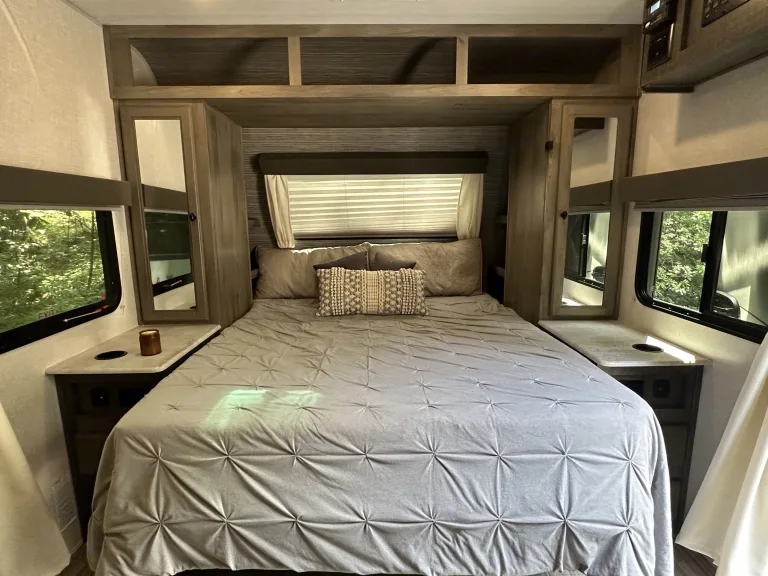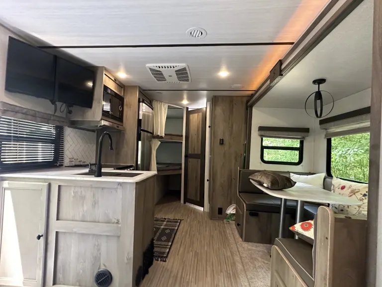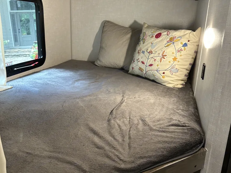 - Dinette converts to a full-sized bed that easily sleeps up to 2 people.Bring your s'mores and get ready to have a fantastic time camping!RecommendationsWe recommend that you bring your own linens and pillows for your comfort. If you need these items, please let us know.Other things to noteWe love our camper and keep it nice and clean and in good working order for others to enjoy. Please ensure you are using the outdoor mat to wipe your shoes/feet off to keep extra debris out of the camper.We do not allow pets, or smoking of any kind, including vapes, in the camper. An extra cleaning charge will be applied if this rule is violated.