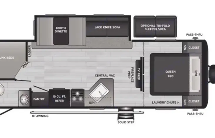 Featuring a cozy and stylish interior, this RV comfortably sleeps 8 with its ample sleeping accommodations. The spacious master bedroom provides a restful retreat, while the bunkhouse area offers a fun and comfortable space for the kids or guests.
