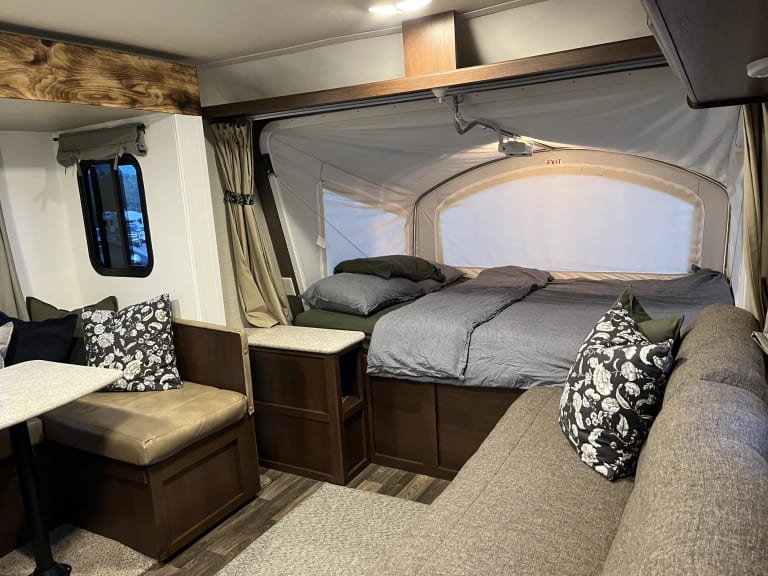 Our little BIG home away is our 2017 Bullet Crossfire 2190ex, and is just that. At only 25´ towing length it is easy to tow and maneuver through campgrounds, gas stations, etc., but once set up it is a large spacious home away that comfortably accommodates our family of 7! It is in great condition and perfect for a family camping trip with plenty of room for sleeping, your things to be put away and dining, games or relaxing inside if needed. Air conditioning makes it comfortable on even the hottest days. Three queen beds (one of which was upgraded for the parents ;) comfortably sleep six people with additional sleeping space at the couch and dinette if needed. Hook your phone up to the speakers for music inside and outside. There is a TV (with rooftop antenna) & DVD player if you are in the mood for a movie night.Inside you will find storage in the bathroom, pantry, by each of the queen beds and under the dinette benches. The refrigerator and freezer are a great size and keep things cool regardless of weather. Both A/C and heat run on electric hook ups. Propane can be used for the refrigerator and heat if electric hook-ups are not available.Easy to tow, set up and tear down, this is a winner!Other questions? Just ask, I am happy to help however I can. We also are available 24/7 while you are traveling for support if needed.Specifics: