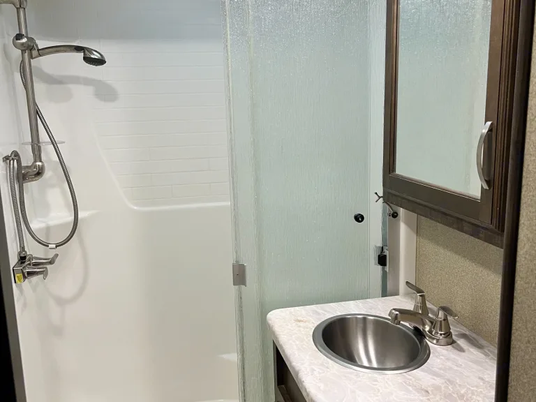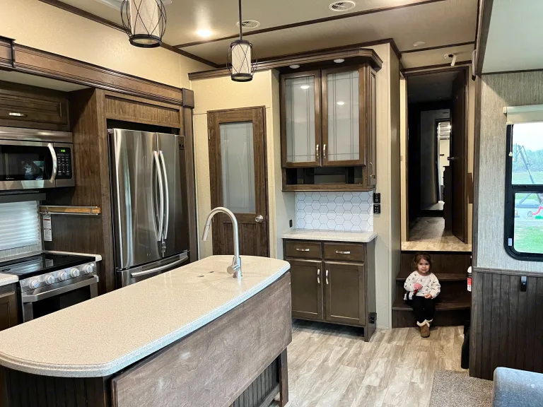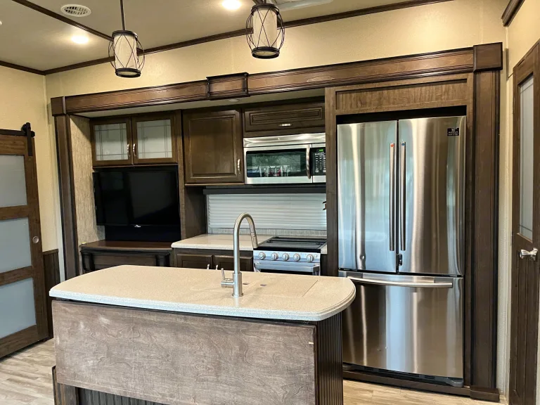 The Kitchen has a large sink, propane oven and stove, microwave, and a residential size refrigerator and freezer w/ ice maker. Comes stocked with travel friendly dinnerware, cooking pots/ pans, cooking utensils, and Keurig coffee maker.