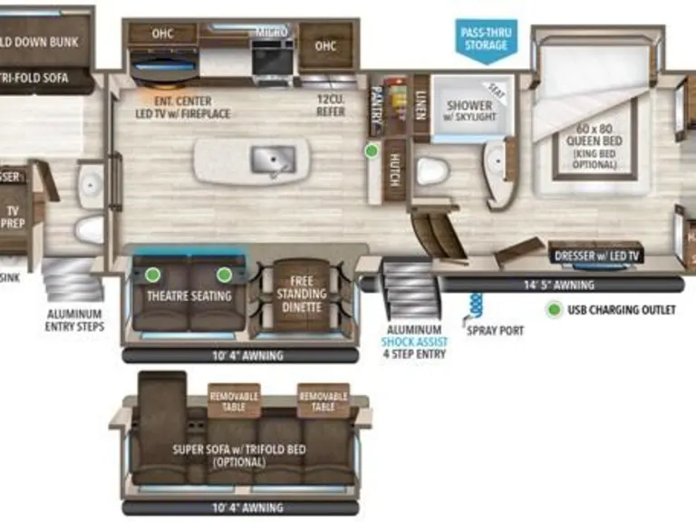 Outdoor Accessories: 4 camping chairs, 1 folding table, and 2 electric awnings with LED lights.