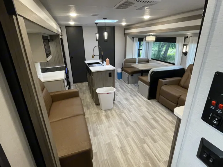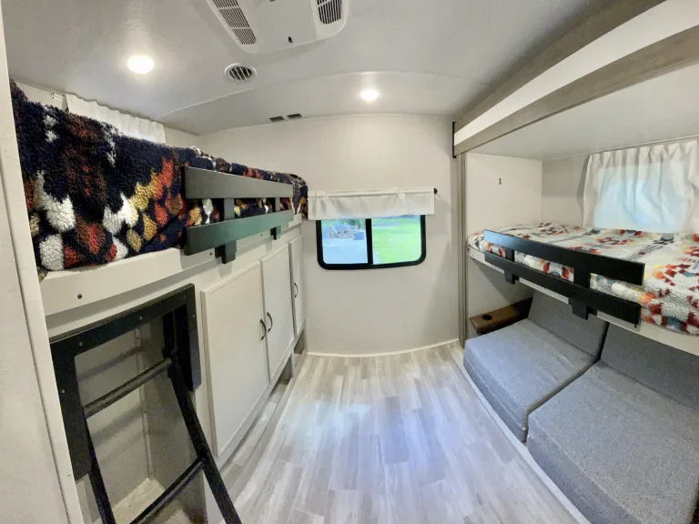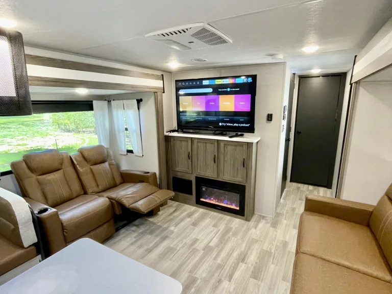 It's A Vibe! Brand new 2024 Forest River Vibe 34bh - everything you need for a comfortable traveling adventure. Perfect setup for a family or group. Featuring two ACs, a tankless water heater (never run out of hot water!), gas stove, microwave with built in air fryer capabilities, functional electric fireplace provides heat and ambiance, with WiFi and Amazon Firestick Included. Sleeping arrangements offered with a queen bed in the Master bedroom, a pull out sofa, a convertable dining table to bed, and a bunk room with two twin beds. The outdoor amenities offer an outdoor shower/rinse station, exterior lighting, speakers, a TV, two mini fridges for all your refreshments, and an outdoor shower for your entertainment while you enjoy the outdoors. **This 2024 Vibe 34BH is a 50 amp unit.What's includedFresh linens, foldable chairs, board games, TV, WiFi, RV safe toilet paper, fans, propane tanks, 50 amp surge protector, dual stage water filter, cookware and utensils. a weight distribution hitch is available for use during the rental period. RV Delivery, Pickup, and Setup available within 50 miles radius upon request.Other things to noteNo Pets and No Smoking!