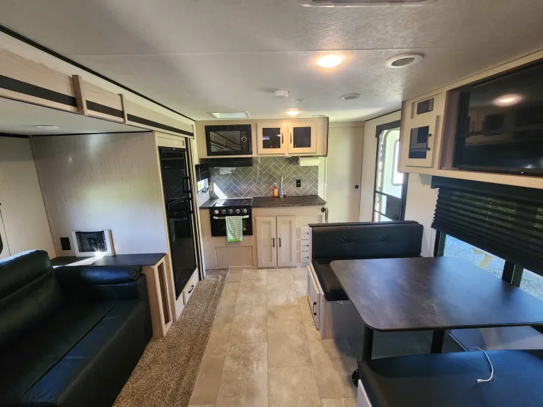 Outdoor Kitchen: Keep the mess and heat outside while flipping burgers or making breakfast.Full bathroomBonus Perks: Air Conditioning & Furnace – Stay cool on hot days and warm on cool nights.Bluetooth Stereo & Indoor/Outdoor Speakers – Bring your playlists to life around the campfire!Delivery Available! No tow vehicle? No problem! Delivery, setup, and pickup services available between friday nights and Sundays nights, (within reasonable distance)Please note this is a no smoking no drug use trailer (this includes all electronic smoking devices), any evidence of such done in this trailer results in a forfeit of your entire deposit for professional cleaning. We are kid friendly and need to keep this trailer safe and clean.Optional Add-ons: