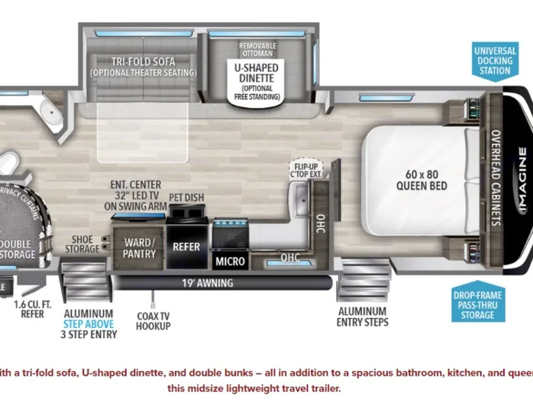Comfortable travel trailer that has barely been used. Comfortable for kids using the twin bunk beds and privacy for parents with an enclosed master stateroom with a queen bed and its own exit door to the outside. It includes all the needed amenities needed for a great trip!In addition to the twin-sized bunk beds and the queen master, the separate couch and dining table both turn into beds.For each trip, all linens are washed on the hottest setting and the RV is fully scrubbed and sanitized. This travel trailer is delivery and pick-up only. I will drop at your campground/location of choice and pick back up.What's included