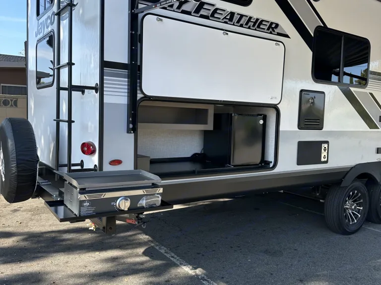 2024 Jayco JayFeather 29QBH, 36ft travel trailer fully equipped and furnished for all types of camping for you and your family to make the best memories outdoors- a home away from home. It features a power awning with LED lights to brighten your nights and keep you protected from the elements, a generator to aid with dry camping, 3 burner stove top, above range microwave, large sink, a couch that folds into a full bed as well as a booth dinette that converts into a full bed, and rear private bunkhouse with 3 bunks and a couch that folds into a full bed that can each easily fit an adult with room to spare along with plenty of in bunkhouse storage. Built-in surround sound speakers both inside and outside powered by a Bluetooth stereo, central AC with 2 units; 1 in the main cabin and 1 in the master suite and heat controlled with a digital thermostat, a full RV size refrigerator, a front private Queen bedroom with triple wardrobe and overhead storage along with additional under bed drawers for even more storage space. A full bathroom with a large standing shower stocked with plenty of towels and RV toilet paper for your trip. Each room has its own smart TV for plenty of downtime entertainment. There is an abundance of cabinet and pantry space stocked with a mini Keurig, coffee mugs, air fryer, mini blender, plates, bowls, cups, children’s cups with lids and straws, pots, pans, baking pans, silverware, knives, cutting boards and cooking utensils. All linens and pillows will be provided unless otherwise requested. The outside kitchen is equipped with a mini fridge, griddle and outside shower to hose off after an activity.