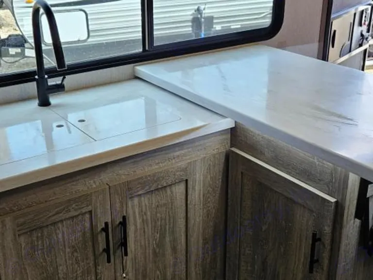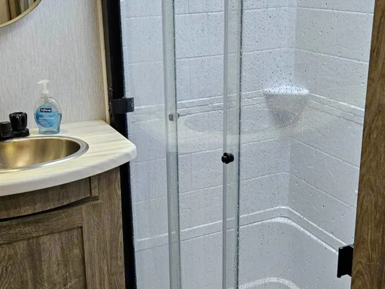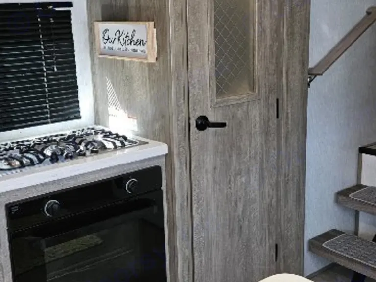 This salem elite has all you would need in an rv. King size upgraded mattress in the master a separate bathroom with full shower in the master bedroom. It has a half bath in the middle and sleeps 4 on the 2 pull out sofa queen beds. Has all the amenities inside and out. Inside a 65" smart tv. Stereo, fireplace. It has a full size residential refrigerator.  It has a double sink in kitchen, 3 burner stove and oven. Microwave. Ice maker available as well. It has an outside pull out kitchen with a blackstone grill and outside tv. All items needed to camp are included in this rental. Large storage areas underneath as well as inside.