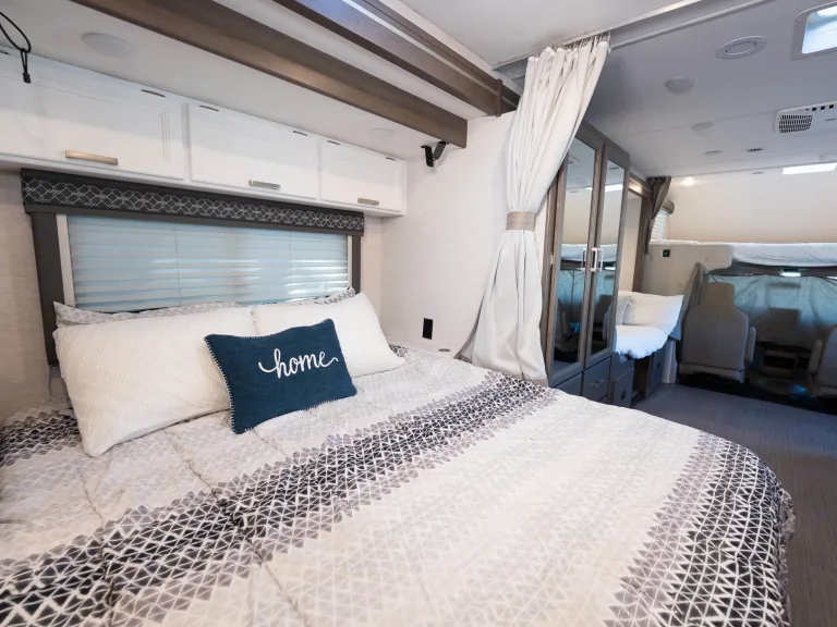 Comfy Sleeping Setup – Private queen bed, overhead cab bunk, and convertible dinette