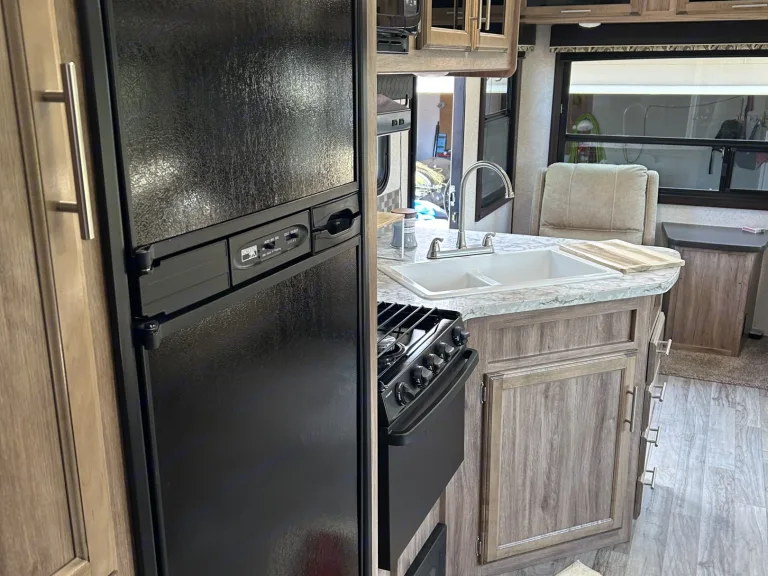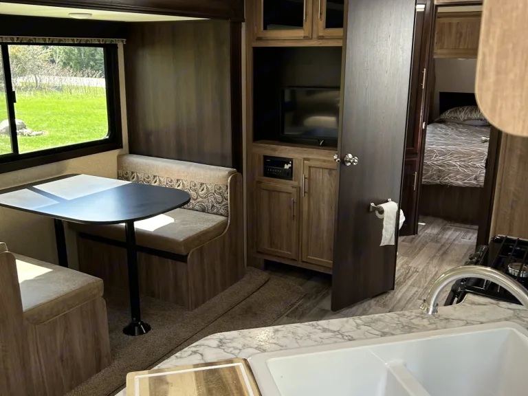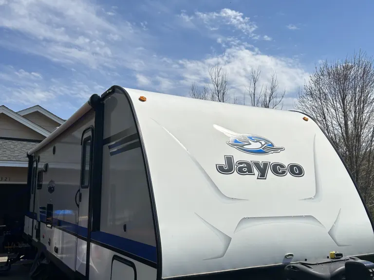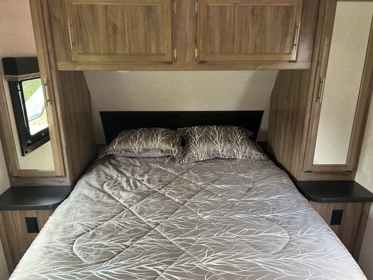 This smoke-free, pet-friendly Jayfeather travel trailer provides such a comfortable homey feel the moment you walk in that you will forget you are even camping! The comfy recliners are perfect for a nice nap or kicking your feet up to watch some tv after a long day. The cozy sofa and dining table both turn into full-size beds allowing for more comfortable sleeping arrangements. Not to mention the private bedroom in the front of the trailer with its own separate entrance, a queen-size bed, and plenty of closet and drawer space to allow for all your necessary clothing and accessories. Comfortably sleeps six people. The kitchen is fully equipped with a gas stove/oven, sink, spacious fridge/freezer, microwave, and tons of storage space. This oasis on wheels also has a full bathroom with a spacious walk-in shower.