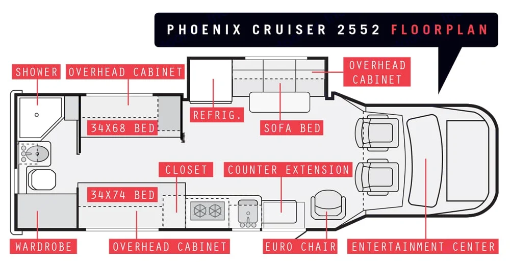 The Phoenix Cruiser has rear twin beds, a standard slide where two full extention recliners become two sleeping spots, a full sized RV shower, convection/microwave oven, large sink, full extension drawers, cutting board, clothes closet, leather like swivel passenger chair and with an additional reclining chair. The two individual seat recliners (looks like a loveseat couch) make into a double bed or two singles. It has an electric 17 ft. awning which can be extended to provide shade if wind is less than 15 mph.