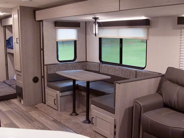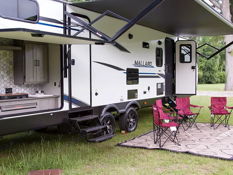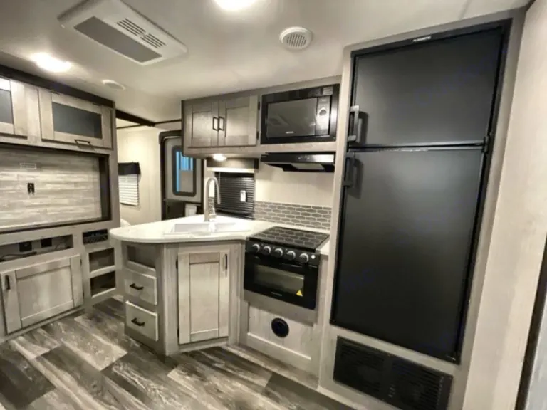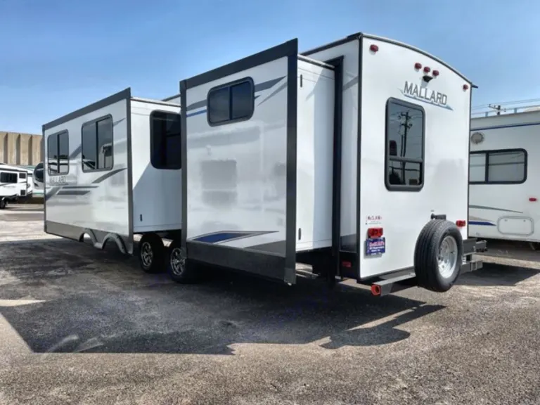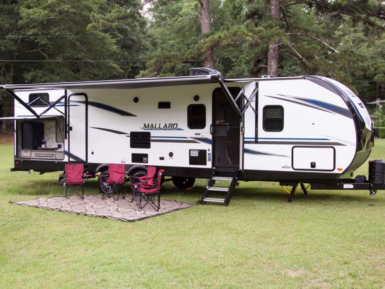 This is a large trailer that will sleep 8! It has two slides and an outdoor kitchen/entertainment area with a fridge! It has two doors with one opening directly to the bathroom. It is meticulously maintained.