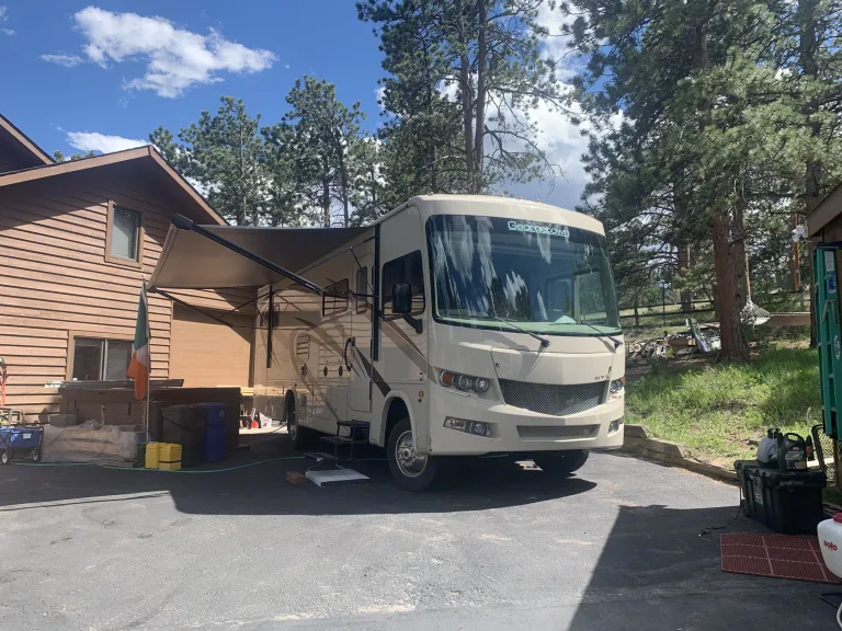 RV will be set up at one of 3 RV parks in Estes Park. Renter to secure RV site. Once site is reserved, we will deliver RV and set up. We will pick up RV when Site rental is up. RV sites are listed in additional info. Clean, 2 slide outs (master bed and living area. 3 TV's (Mbed, Living area and outdoor). Lots of storage. Fully equipped kitchen. Furnace and AC. Automatic canopy. What's includedSet up at camp site. Longe chairs