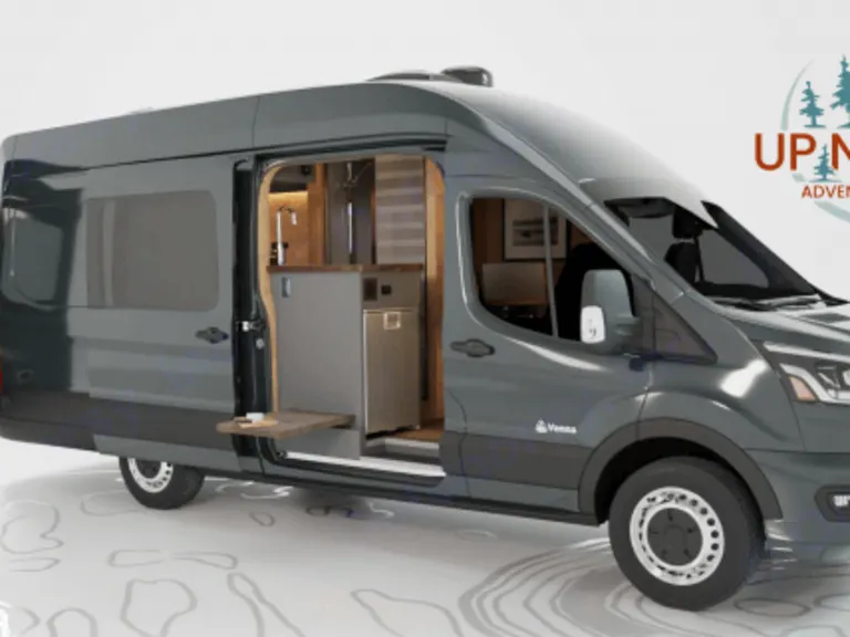 Take the Road Less Traveled... Up North Adventure Vans are perfect for those that want to “get away from it all” – but not away from convenience.Designed for up to two people, our luxury camper vans include a kitchen, sitting area, shower, odorless toilet and a queen size bed. And unlike RV rentals, our vans can go off-grid and are 4-season, even at 30 below!Our camper vans have been professionally customized and thoughtfully designed with renters in mind to make your vacation as convenient as possible… a fixed bed so you don’t have to assemble your bed every night, a full-length queen size mattress to accommodate taller people, moveable tables and camp chairs to enjoy your meals inside or out, running boards and grip bars to make it easier to get in and out of the camper van, and an odorless dry-flush toilet so there is no black water tank – yes, you can take a dump without any dumping. :-)As much as possible, we have outfitted our camper vans with amenities made in the USA. You'll find dishes, silverware, utensils, and cooking pots made in the USA. Not only is that good for America – it is also better for our environment.Healthy sleep starts with breathable bedding. The mattress, pillows, bedding, bath sheets in our camper vans are made in the USA of natural textiles. We wash our linens with eco-friendly detergent and avoid harsh additives for those with allergies.What's includedINCLUDED IN THE KITCHENETTE