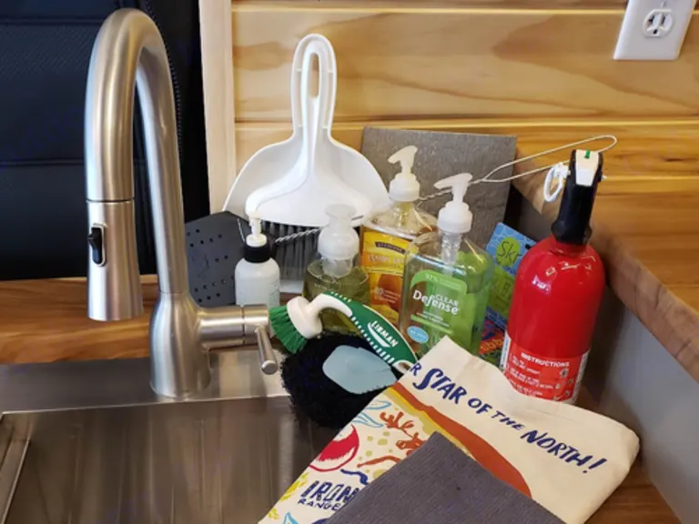 Our camper van kitchenettes include a 2-burner stove-top (propane gas), mini refrigerator, and sink. The two moveable dining tables allow for extra counter space. Up North Adventure Vans are stocked with USA made kitchen tools to make meal prep easy and enjoyable – quality matters!INCLUDED IN THE BATHROOM