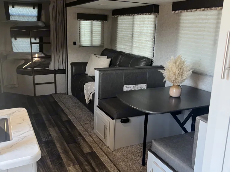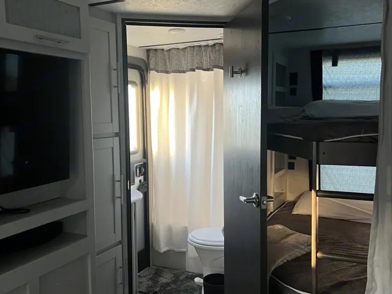 Enjoy our spacious, clean, well maintained 2020 Keystone Bullet. It comes complete with everything that you will need to make this your home away from home. Cold air conditioning or heater to keep you cozy. This trailer comes with a room with a queen bed and lift up mattress with storage. It also includes a bunk bed, pull out couch, and a convertible dining area. It will comfortably sleep 7 adults but up to 9 people with 2 kids per bunk. The kitchen area has a 3 burner gas stove, fridge & freezer and a sink. The bathroom has a standup shower/tub combo as well as its own entrance from outside the camper. Outside you have a power awning with an led light strip, and audio. There is a small fridge with 2 shelves outside. The trailer comes equipped with an electric crank for raising and lowering the tow hitch and stabilizing jacks. This trailer comes with the factory cold weather package. Whether it's summer or winter you can comfortably bring your family and friends for your next fun adventure!