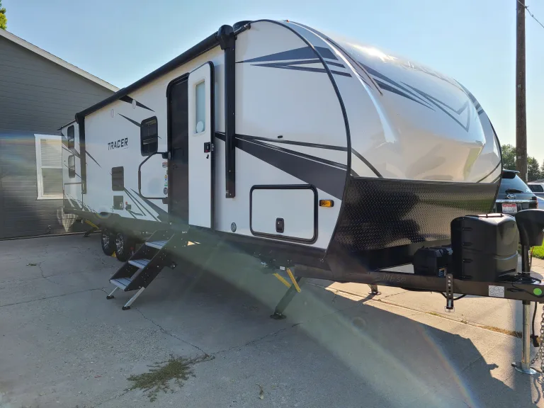 Enjoy the great outdoors of Idaho with our 2021 Tracer quad bunk travel trailer. It will sleep 10 with 1 residential size queen and 4 single bunks, fullsize sofa-sleeper and u-shape dinette, bedding included. Our trailer is easy to set up with a power jack and electric stabilizers. Motion sensor lights in key areas will help when you need it most. We include a 4500 watt gas generator with electric and remote start. It has one smart TV with a bluray player. Equalizer hitch included for safe travel. We provide all the amenities needed for a relaxing weekend away. Pots, pans, dishware, and paper goods. If you're looking for a trailer with more interior space, plenty of sleeping space, an outdoor kitchen, and an outdoor shower look no further than this Tracer travel trailer! The bunkhouse features a slide out for more space.