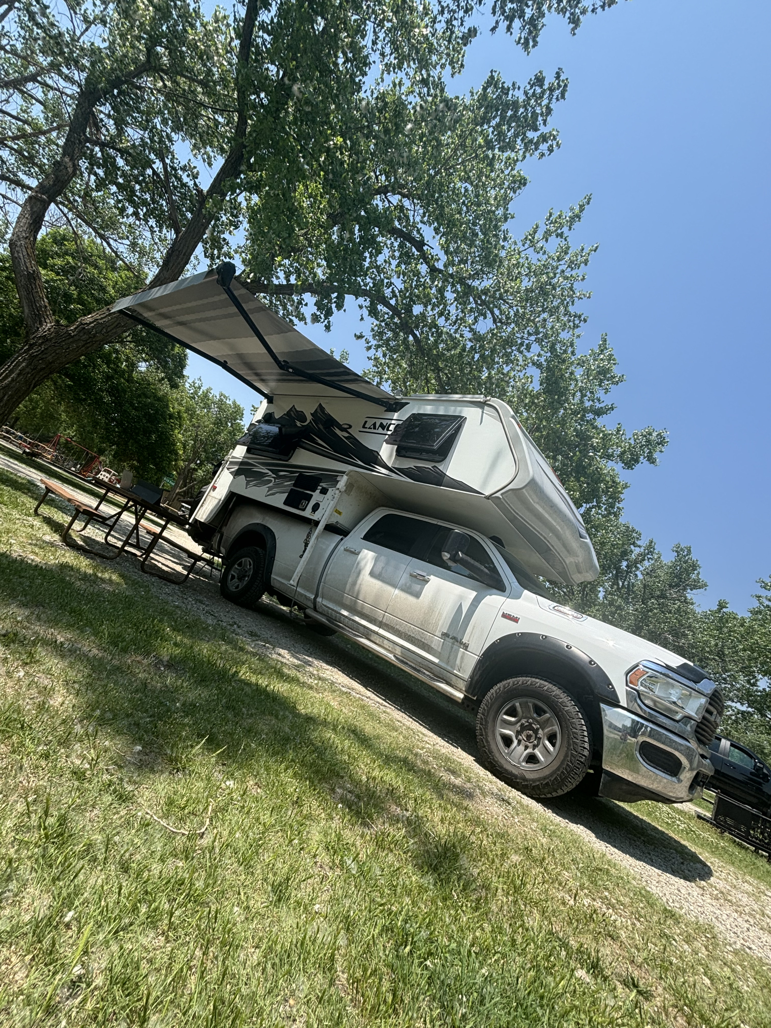 This Lance 850 Truck Camper (2022) sits in the bed of a Ram 3500 Truck (2019). Two people can comfortably sleep in the queen bed and one person can sleep in the convertible dinette. The crew cab of the truck has plenty of room for storage or can seat up to 6 people.In the camper, there is a kitchen area with a sink, fridge, freezer, propane 3 burner stove and microwave (only runs on shore power). Seats up to 4 people at the dinette. Camper includes a wet bath with flushing toilet and hot shower.Easy to operate control panel so camper can run on propane heating or AC when plugged into shore power. Solar panels on top of camper charge the lithium batteries which allows you to enjoy nature and still have a comfortable bed, movie night and proper dinner.Lots of opportunity to explore National Parks, BLM, and so much more! You are not just renting a camper but an experience to adventure and enjoy nature . Have fun and be safe!What's included• Fresh linens, towels