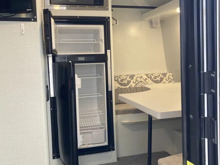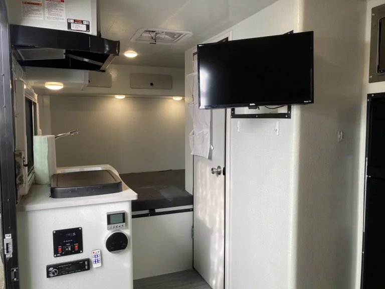 The kitchen includes a microwave, 2-way (AC/DC) 6 cubic foot fridge with large freezer compartment (fridge is electricity-dependent, does not operate on propane), 2 burner propane stove, stove vent hood fan, portable induction cook top that can be also used outside, a large sink, and includes pots/pans, and utensils (see photos for items included). There is a Bluetooth stereo with in/outdoor speakers, a 10’x8’ powered awning with LED accent lighting, and 2-20# propane tanks. The trailer has ample lighting options and a skylight with variable speed, bi-directional ceiling fan.