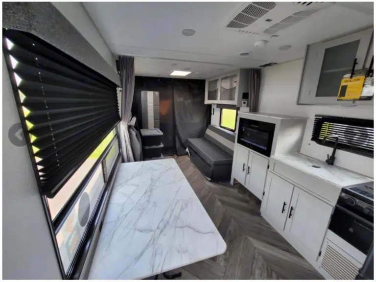 Ramp door adjusts to form a gated patio. The Fold-Out bed opens up to a king size but couches can be 2 twin size beds.What's included2X camp chairs, cookware, utensils, espresso machine, coffee pot, fresh ground coffee (upon request). E-tracks with ratchet tie downs are located in camper. Pick Up at Colvin's Country Carpets. Delivery, set up and pick up available upon request for additional fee within 150mi radius.