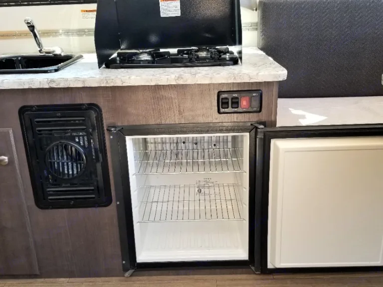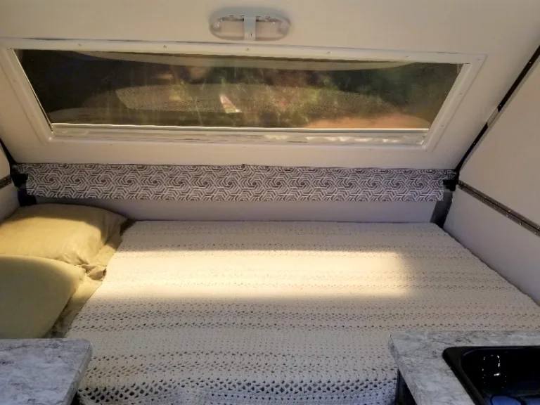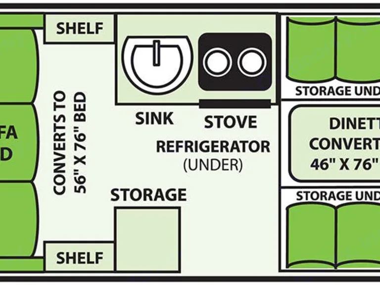 My little home away from home is easy to tow and set up. Perfect for boondocking or the campground. It features a double bed and a twin bed converted from the kitchenette. A ceiling fan, air conditioner and a heater will keep you be comfy. A refrigerator, sink and stove complete the kitchen.