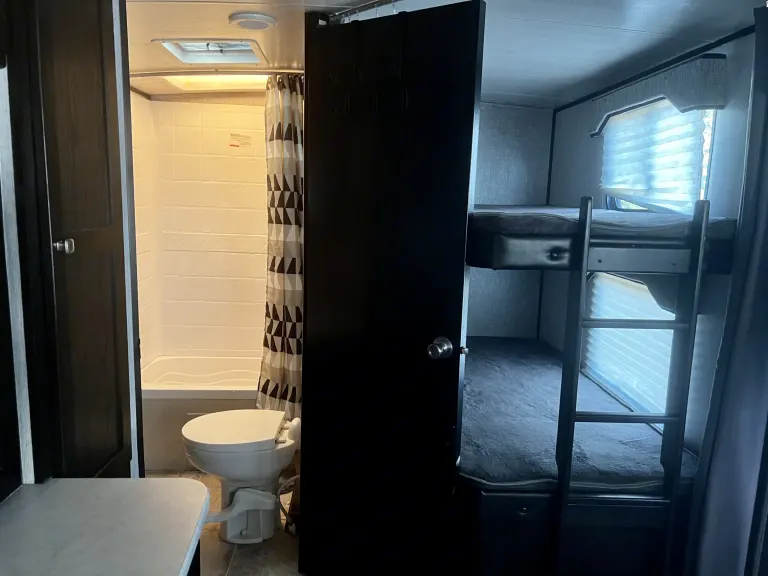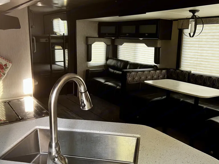 Great for the family and extended stays!Huge discount for extended stays! Perfect for travel contractsFeel close to home in this house on wheels. This camper will be equipped with essentials that include, but not limited to: coffee maker, towels, bedding, utensils, and plenty more to make your stay easier for you.Features a main queen size bed, full over full bunk beds, dinette conversion area, and sofa bed.