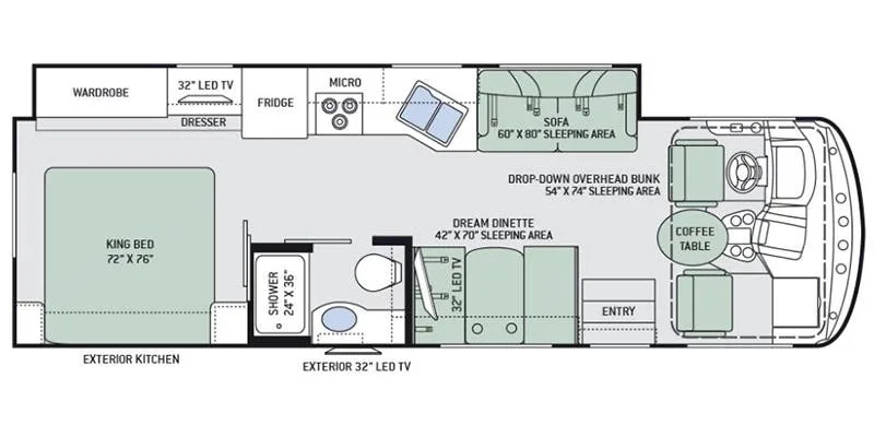 This is our family RV! This Class-A motorhome has a king sized rear bed and a drop down double sized bunk above the driver's position. There is also a fold out couch and a dinette can be converted into additional beds. It has a single, port side, super-slide which really opens up the space inside while set up for camping! There is a lot of room in the undercarriage to store all your camping gear.We live in the Franklin area and have used this rig for several trips to visit family and friends. It is great for a weeklong beach trip to Florida or for a stay at any campground in the great State of Tennessee. The overall length of this RV is 30.5 feet and it fits in most State Park Campgrounds.What's includedNOTE: