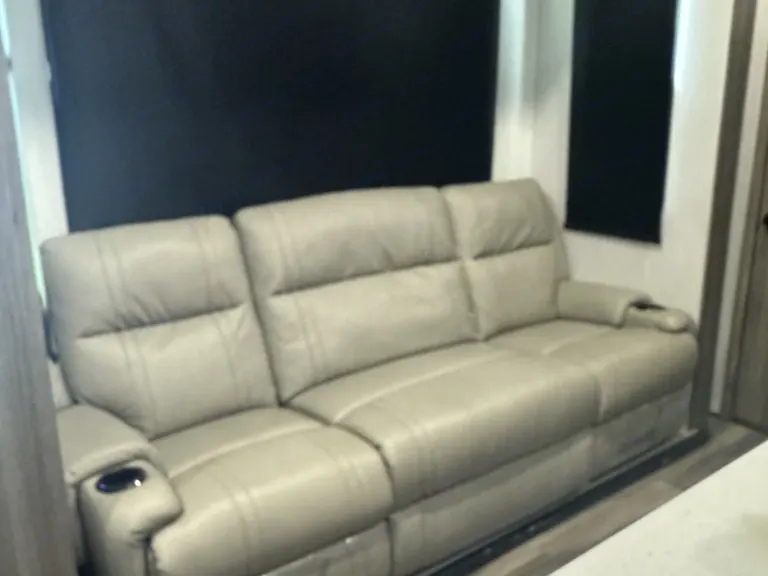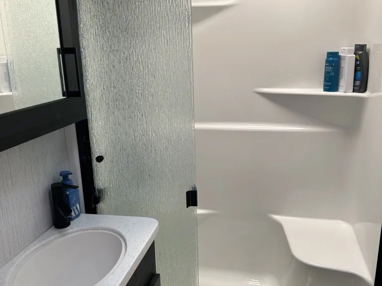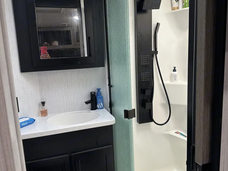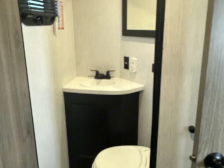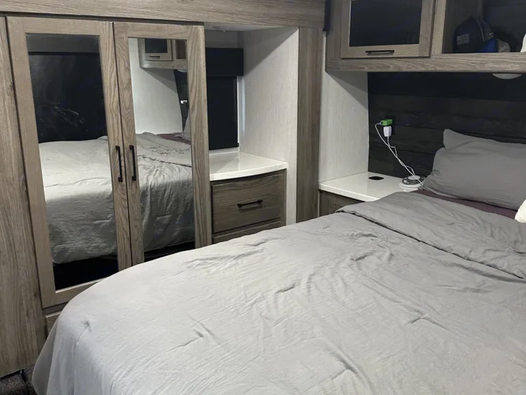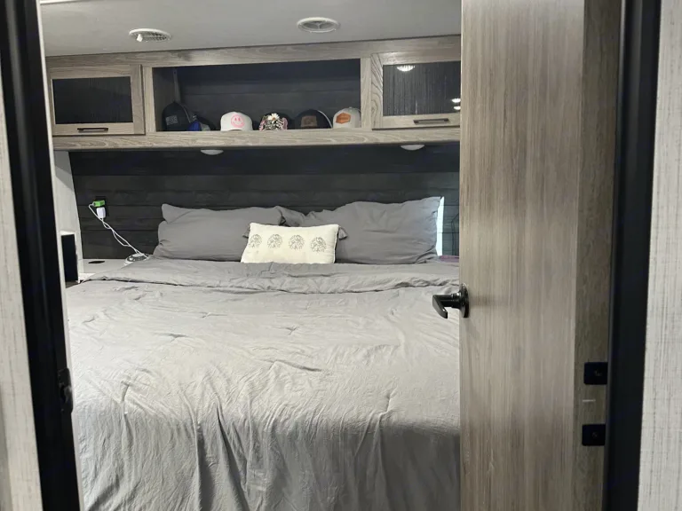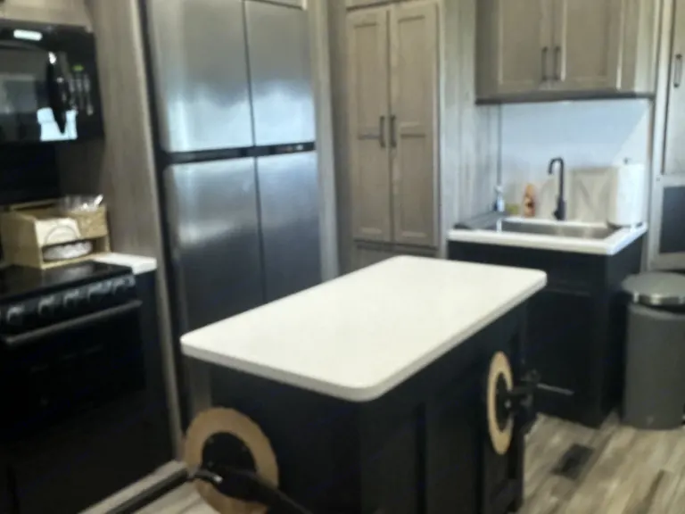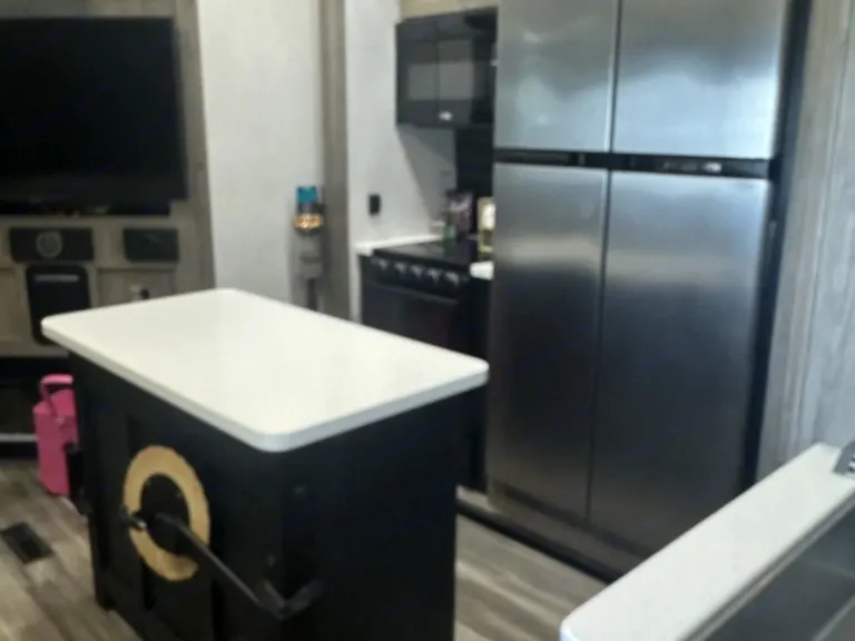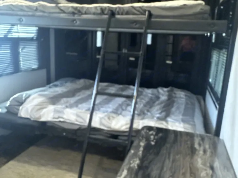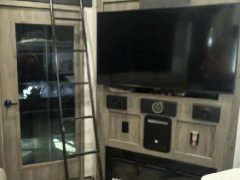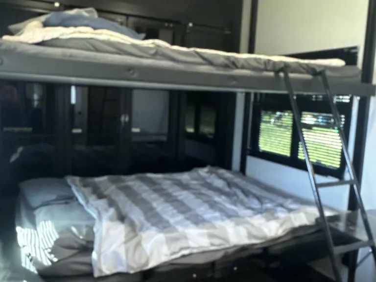 2022 Toy Hauler Camper with 3 large awnings, back fold down patio large garage for entertaining or with double bunk queen beds and small 1/2 bath. Living/kitchen has a. Full size couch w 2 recliners and a flat screen tv with a gas fireplace, island with 2 pull out bar stool. Large fridge, pantry and farmhouse style deep sink. There is a twin size loft bed off to the side of living. Master bed and bath has a large king bed with memory foam topper and luxury shower. What's included•Blankets, pillows, sheets