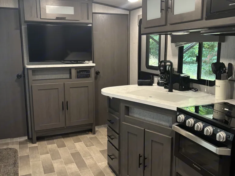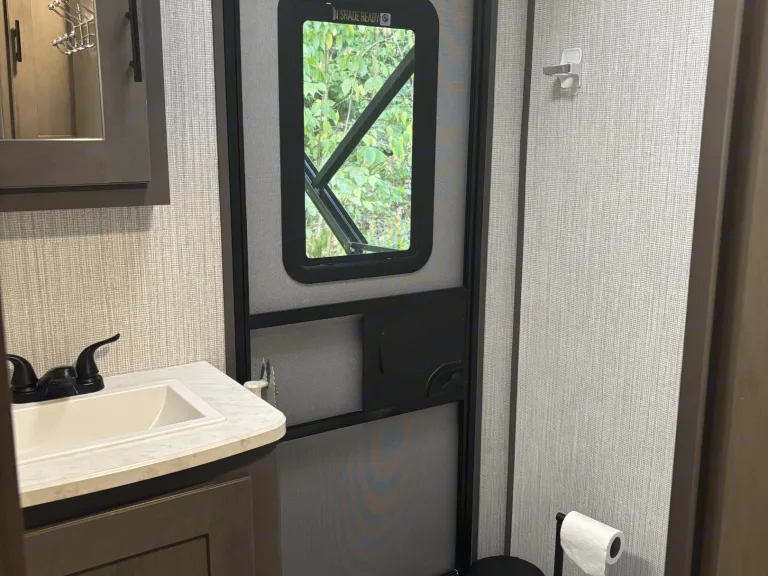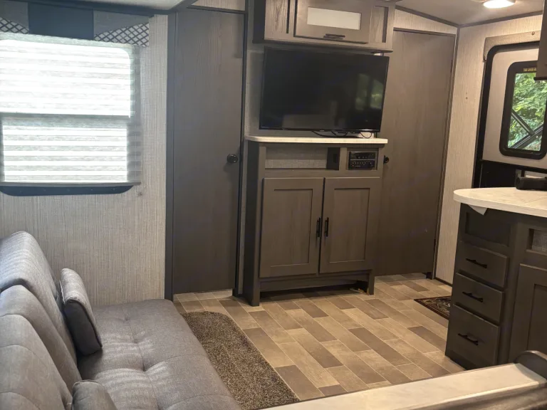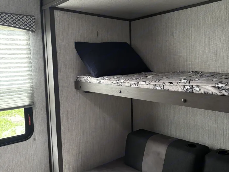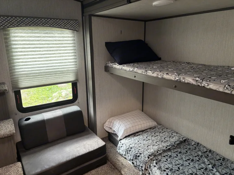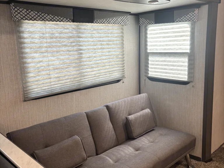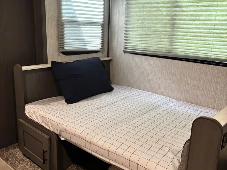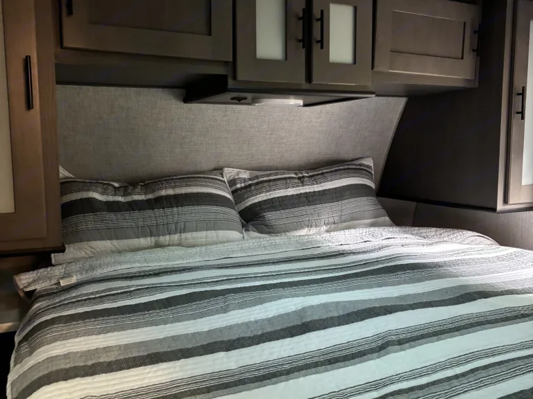 This trailer is a beauty! The king size bed is very comfortable. The trailer is very clean. There is some wear and tear, to be expected, but nothing that can’t be worked around. For example, some light shades don’t pull up… we used a hair clip.