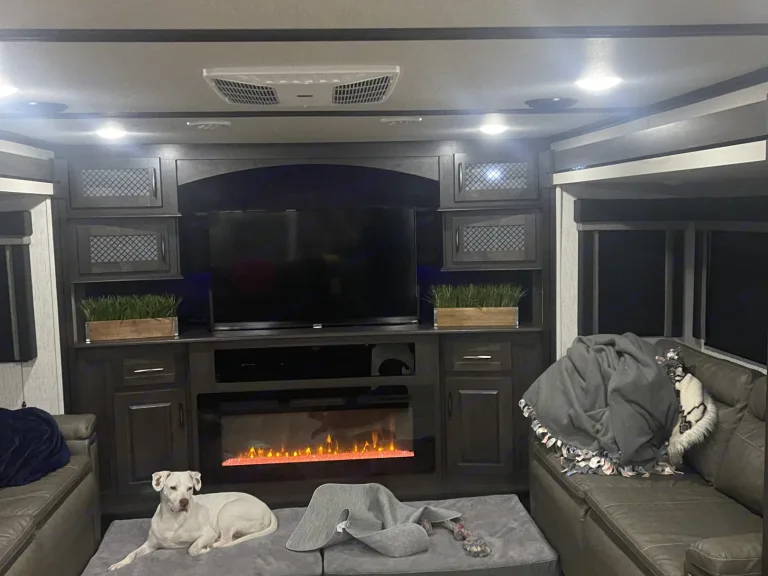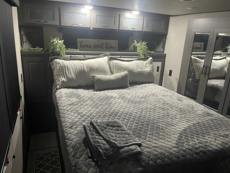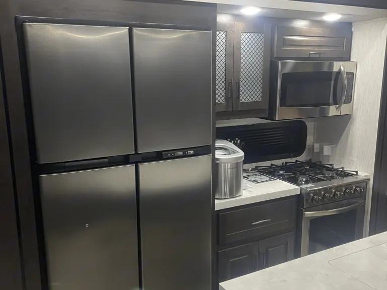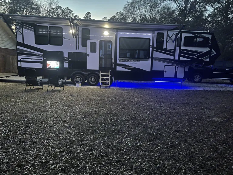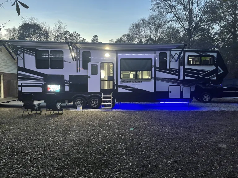 All the amenities in one comfy getaway. Perfect for dry camping or beach side camping. Unlike traditional toy haulers you lose no space due to the garage. Black out dates may apply due to our vacation schedule. We will update the description as dates are set Black out Dates: July 1 through July 31. Current Blackout dates: Apr-26 to May-14 Features outdoor kitchen with mini fridge and smart TV. 30ft of awning with LED lighting. Inside front living room features theater seating with vibrating and heated seats and 2 couches that fold out into queen size beds, electric fire place, Kitchen features center island with marble top and marble counters. 18 cu. ft. fridge, residential microwave, gas stove with oversized oven. Shower features a body shower as well as a seat to sit on for shaving, bedroom features comfortable bed with cooling pillow top, and smart TV. All TVs are roku TVs. What's includedCamper has everything you need. Silverware both plastic and metal (we sanitize everything after every rental) pots, pans, table ware paper and ceramic, cups, Air fryer, keurig, electric skillet, basic seasonings, fresh linens, towels, wash rags, chairs, four wheeler (optional rental not included in price) blue ray DVD player, Bluetooth connect for steaming music from your phone to indoor and outdoor speakers. Also includes 4 outdoor chairs and folding table additional metal folding chairs available upon request. Peace of mind set up. We will show you everything you need to know about the camper and set everything up on delivery. Everything you need, just bring the family food and drinks and be ready to relax.RecommendationsAll of the springs are great, huegenot beach is also a great place to camp to if you want to be right on the ocean and watch the ocean traffic with great beaches. Other things to notePets allowed, we love our fur babies and don’t leave them behind when we camp. A $250 non refundable cleaning fee for up to 2 pets will be required on all reservations. Florida weather is unpredictable so we ask if you leave the camper make sure the awnings are in the stored position. Please treat this as your own. A $250 cleaning fee will be assessed upon return or pick up if camper is messy beyond normal use. We do sanitize all dishes and pans but please wash your dishes after use. Our goal is to provide a great experience for you and your family please help us in achieving that with taking care of this camper. Any damage or issues must be immediately reported. Smoking in the camper will incur an additional $300 cleaning fee.