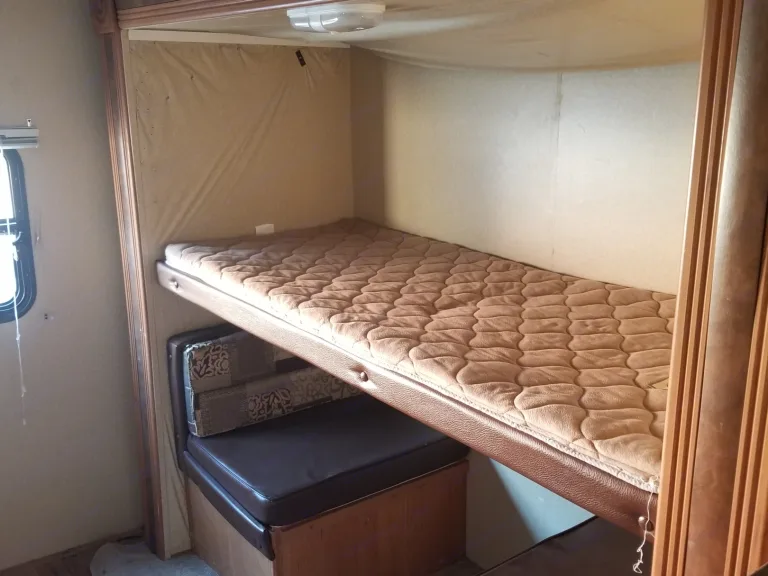 Sleeps up to 10. The bunk house with three bunk beds and a convertible sofa in the rear of the camper sleeps 4 and is great for kids. A cozy master bedroom with a queen-sized bed is at the front of the camper for added privacy. There's also a convertible sofa in the central area that sleeps 1-2 more. Plus the dinette will convert to sleeper as well.
