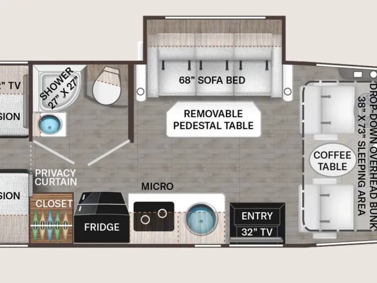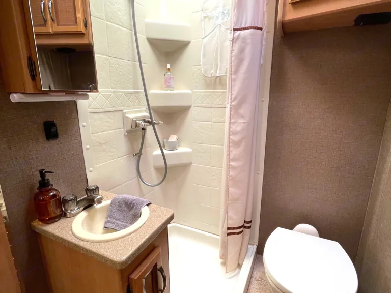 3. The way the bathroom doors fold out and make a big bathroom/dressing roomThis RV measures approximately 25 feet 6 inches in length and features a drop-down overhead loft, a slide-out and a bedroom TV.