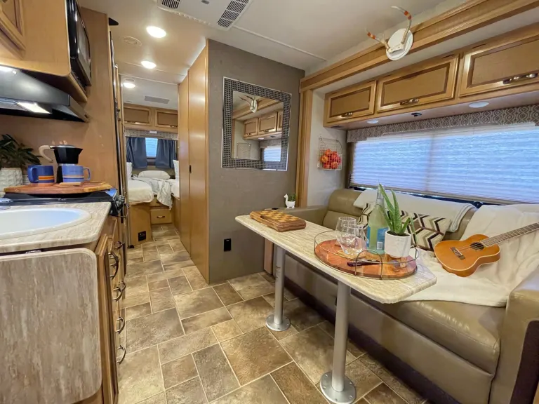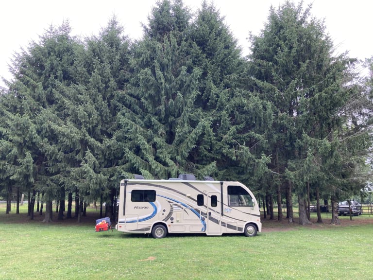 Enjoy the "Big Screen" of a scenic road trip with this huge curved windshield! Great for a couple or a family of up to 5. The Thor Vegas is technically a Class A but with “many of the advantages of the smaller Class C" including easier to drive and park, better gas mileage, and great power up hills! This RV's beds include twin beds in the back which can be converted to one big king bed, a fold-out couch that becomes a queen, and a drop-down twin bunk in the cab area. TVs are in the main center room, the back and one on the outside under the awning.Our 3 favorite unique features that 'sold us' on this RV were: