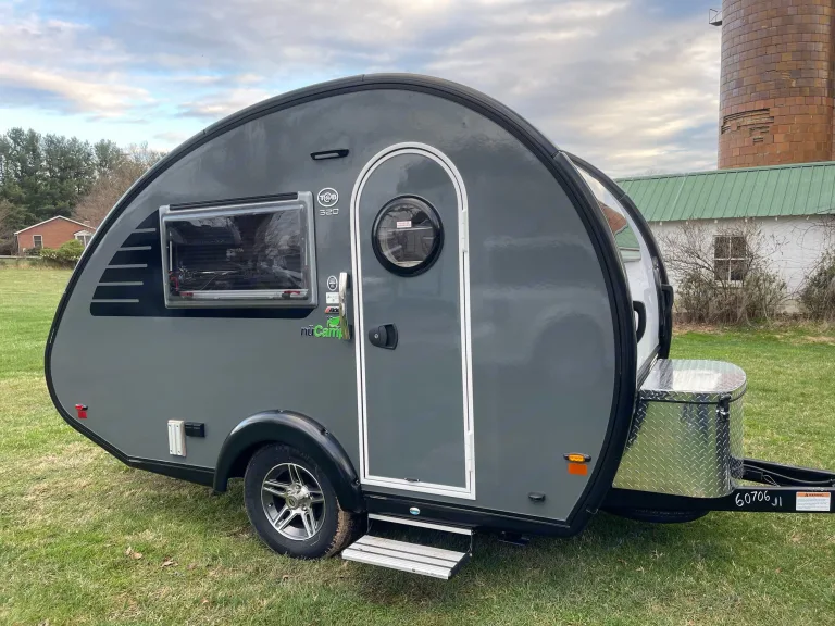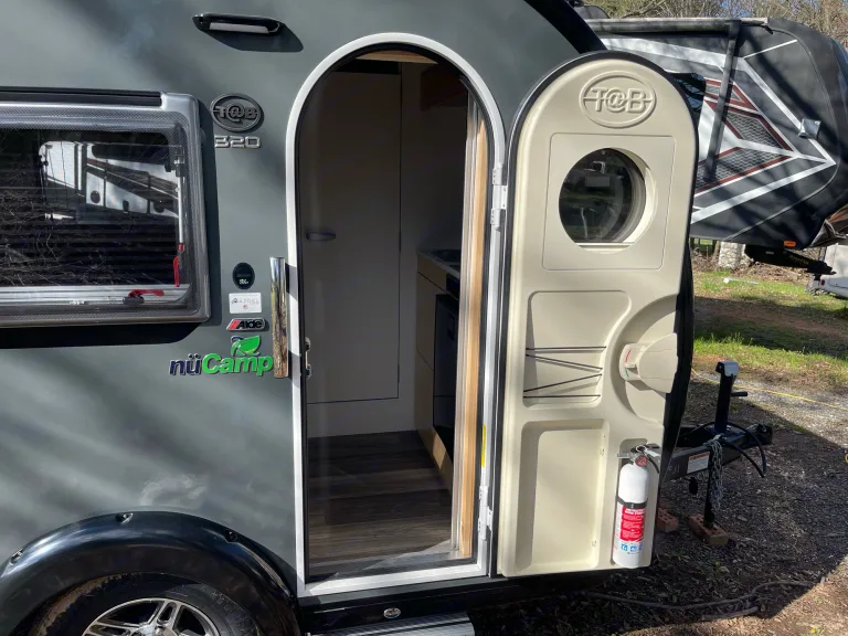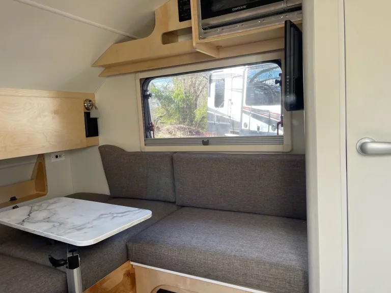 This nüCamp teardrop camper trailer offers an easy-to-tow. Given less than 2000 lb dry weight, it can be towed by many SUVs. The U-shaped dinette can be converted to two single beds or a large 71” x 72” bed for two adults sleeping comfortably. The small kitchen has a sink, two burner glass-top stove, and a 12V refrigerator. This small camper also has an interior wet bath with a cassette toilet and built-in sink. Some other highlights include the Alde central heat/hot water system, the central air conditioner, the Solar Roof package, and the Nautilus water management system. It is a perfect weekend getaway camping camper.Specifications: