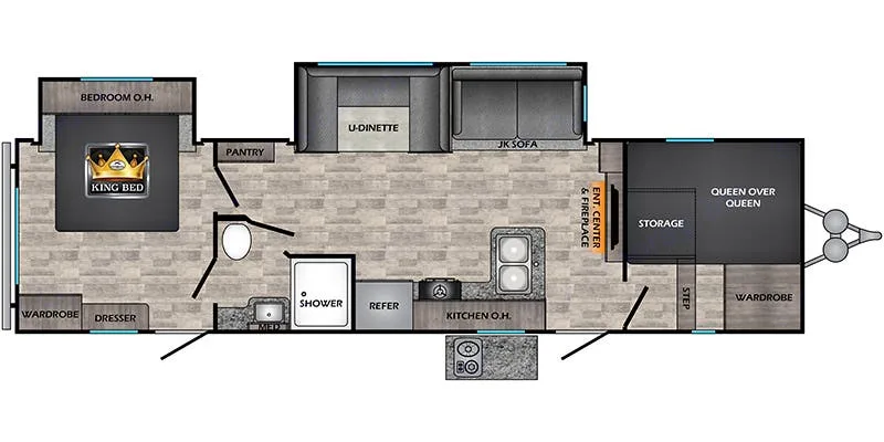 ***upgraded mattresses in bunkroom and King bed**** This RV has great space for families. There is a separate bunk room in the front with double queen bunks with 6in memory foam mattresses, lots of storage. There is also a master bedroom in the back with King size new Memory foam mattress and more storage. In main living space there is a jack knife sofa and dinette that supplies additional sleeping.