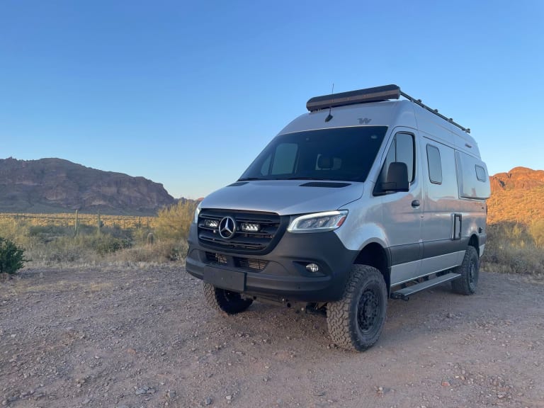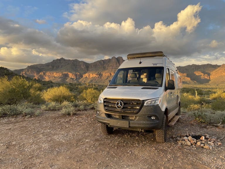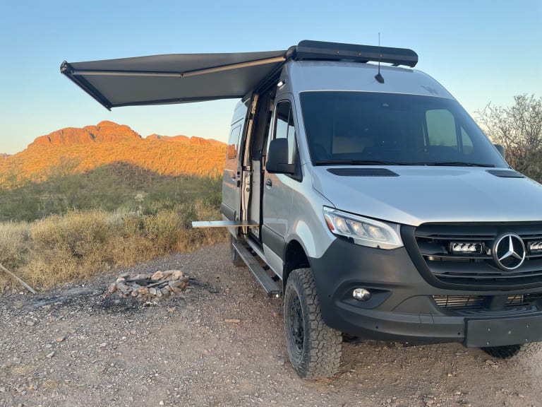 The only way to enjoy the Arizona desert is getting off-road and getting to a spot that other RVs won’t go. We are located 5 minutes from Tonto National Forest(Superstition Mtns) that has 100+ sites ready for you and your adventure; photos are taken in Superstition Mtns. You can find a site within minutes of picking up this RV!! No one else has that convenience!!This Dog friendly Mercedes 4WD will allow you a safe and comfortable place to call home while you enjoy the outdoors here in Arizona. Less than a year old and has all the comforts needed to enjoy off grid living with solar panels to ensure you power all your gadgets. Also has the option to come with Starlink WI-FI if you’d like. Don’t settle for a 2WD when you can have the real thing and be the envy of wherever you roll! Revel is a $200k RV that is the king of the Desert Offroads and is built on a Mercedes 4WD Sprinter van chassis with a HO diesel engine! Van has recently had $20k of upgrades to include a tire/wheel and suspension package upgrade with same size spare tire on back for easy access. Please note most rental vans don’t have same size spare tire which will leave you in a precarious situation if you have an emergency. Also the suspension has setting to provide a smooth drive on highway or trails!All dishes and kitchen amenities included along with pod coffee maker. Bed retracts up if you want more space during day. Powered awning with oversized chairs for you to nap in. XM satellite radio included along with plenty of USB ports everywhere for your phones and tablets.Come enjoy the luxury of a 4x4 Mercedes in the Desert! Don’t forget to bring your furry friend too!Ask me any questions to help make your vacation customized for your needs!What's includedBedding linens