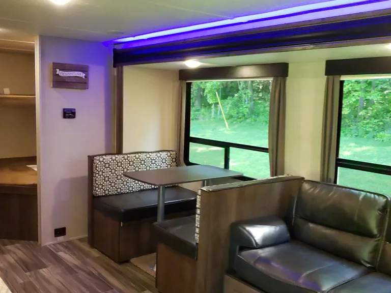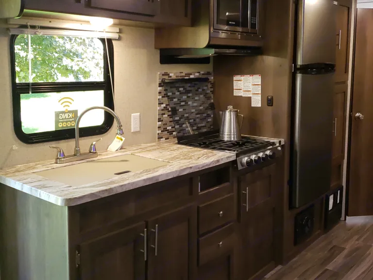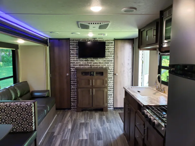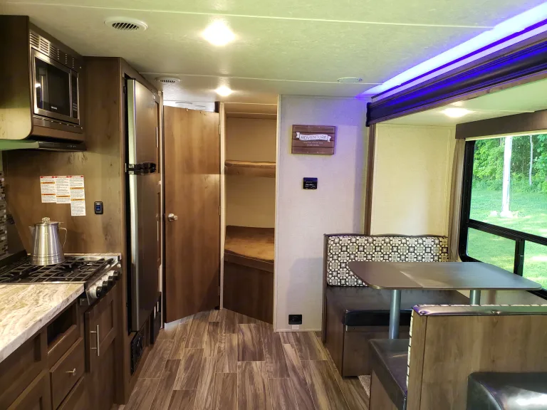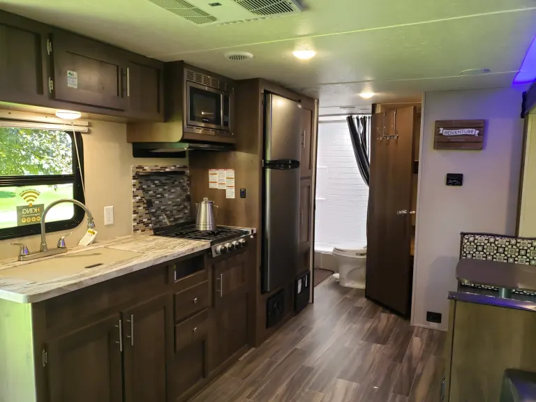 Kitchen has a large 12v refrigerator, fully stocked with tableware, cooking utensils (pots & pans), gas stove-top burners, and a microwave. (Note: Like many RVs these days, there is no Oven for baking to allows for more cupboard space. )Exterior: Electric Awning with blue LED lighting. Comes with a propane grill, 6 camp chairs, and a 9x12ft exterior patio mat.