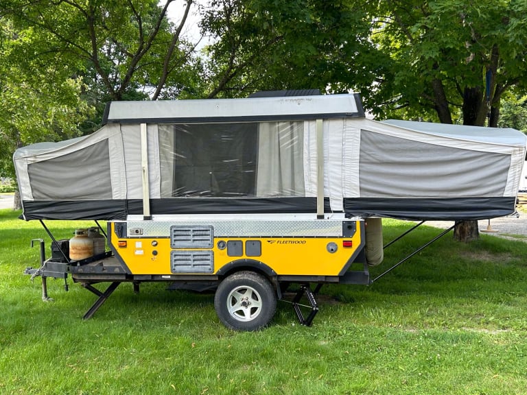 This little pop up camper will get you where you want to go, except across the lake. You’ll need a boat for that. This little guy has great ground clearance and can be easily towed to your favorite camp spot. With heat and air conditioning you’ll be sure to stay comfortable whatever time of year you love to camp just make sure to bring your generator along if you want to run the air. A power cord is provided for 30 or 20 amp. With a fresh water tank large enough to last a few days of dispersed camping or a fresh water hose connection available you will have plenty of water to shower or wash up with the outdoor shower ports. The propane water heater will also help to make sure that you are comfortable while cleaning up. There is a 2 burner propane stove inside and it also comes with a grill for outside if needed. Propane heat is ran off of a thermostat by the breaker panel. It’ll sleep 5 comfortably with a king sized bed on one end and a queen on the other as well as a bed where the kitchen table is that can be converted. So pack up your camp gear and go have some fun.What's includedBring your own camping gear and make some memories. Water tanks and a fresh water hose will be provided if you will have access to water. Propane will be full and a Power cord is provided that can run 20 or 30 amps. Bring your own generator or plug into shore power and make some memories.Other things to noteAbsolutely no smoking inside.