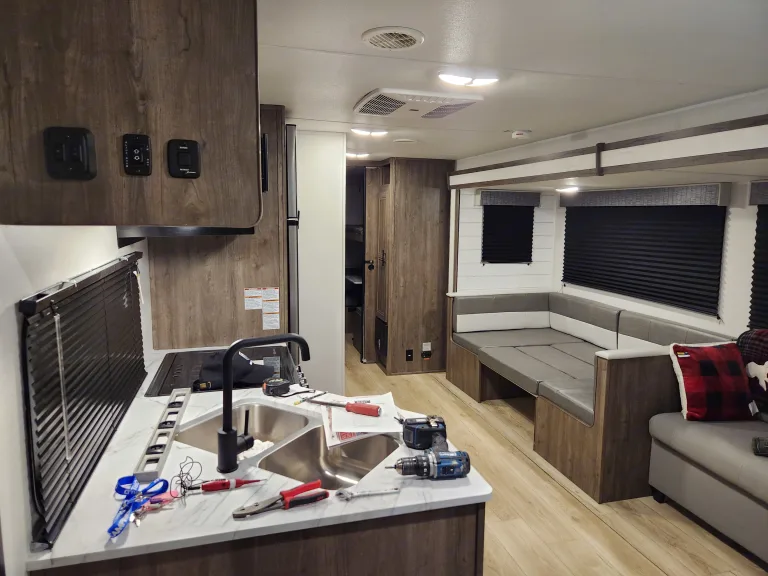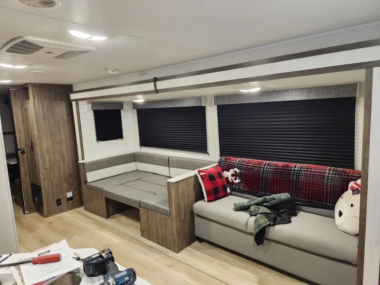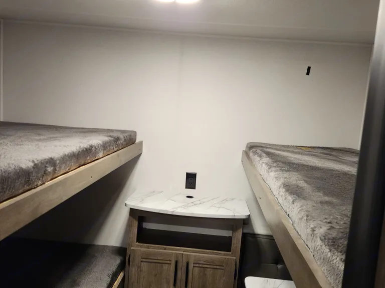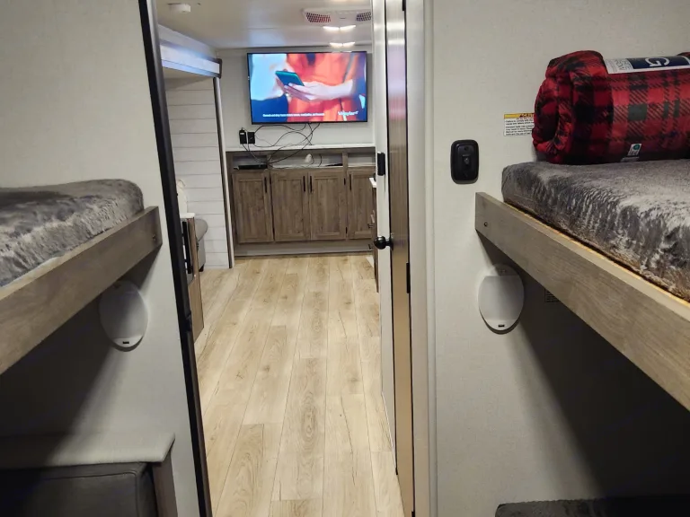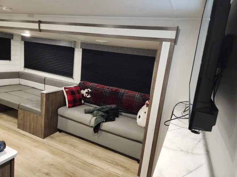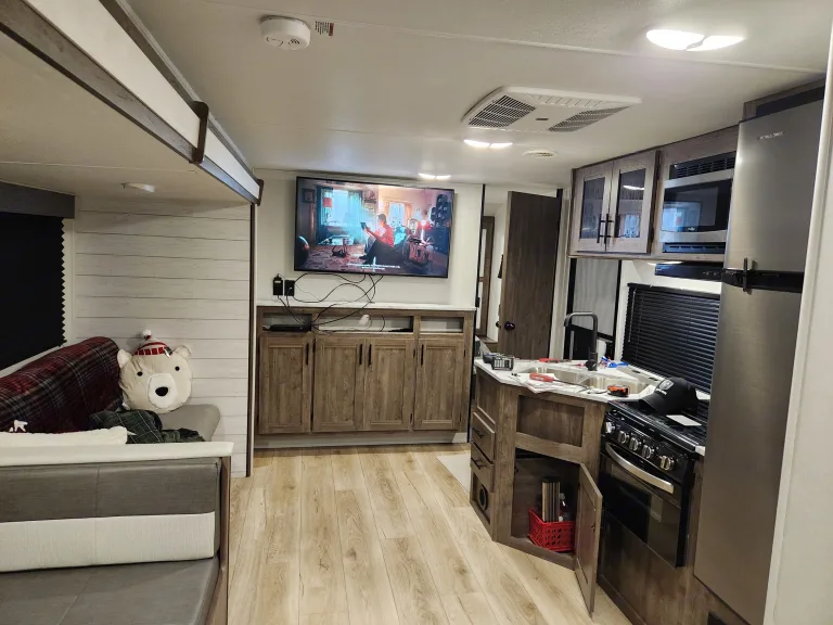 Hi guys, we just traded in our previous camper for this roomy heartland pioneer! It has a Queen bed in a separate master bedroom with plenty of storage and a TV. Then in the center area is a large screen smart TV with a built in cabinet, smart disc player also a sofa that turns into a bed . Next to that is a large u shape dinette it also can convert to sleep 2. The kitchen has a double bowl sink and counter top with drawers on the left and on the right. a 3 burner gas stove with glass top and oven below, then a 10 SQ. FT. 2 dr. 12 volt fridge. and a microwave . to the side is a full bath with stand up shower and short tub . across from the bathroom is a pantry for food, towels lots of of room! Then we have the bunkhouse, sleeps 4 very comfortably, also with a dinette and double booth during the day. A separate lite and plug in for each bunk!! For adults or kids ! Also TV for bunkhouse is on the way. We installed all TVs, none were included. All pots and pans, silverware -utensil are included as well as plates and yes a coffee pot :). We will include bedding for the Master Bedroom and towels for kitchen and bathroom. Central air conditioning and heat.What's includedAll towels and silverware are included, cups and plates, coffee pot, and bedding for master bedroom,RecommendationsTake Hikes, campfires , check out the area.Other things to notePets welcome, No smoking